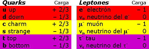 Para terminar con la primera tabla, tenemos los muones y los tau que son como electrones pero mucho más masivos. Sólo existen en los aceleradores de partículas y en reacciones de altas energías que se puedan dar en estrellas o fenómenos estelares. El muón y el tau también tienen su correspondiente neutrino.